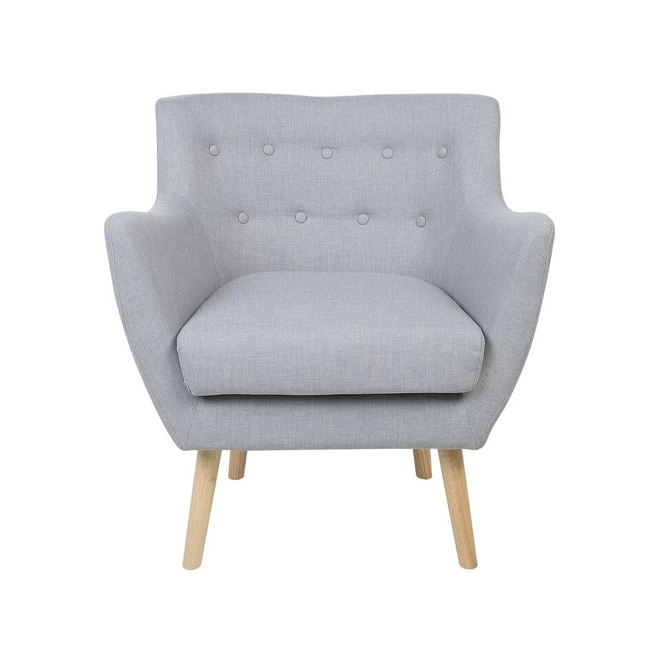Gezellige fauteuil in grijs met retro flair. Deze fauteuil maakt indruk met optimaal zitcomfort, een charmant ontwerp met retro flair en een gezellige uitstraling. Dankzij de heldere, vriendelijke uitstraling is het perfect te combineren met alle inrichtingsstijlen. De aangenaam gewatteerde zitkussens en gebogen armleuningen nodigen je uit om veel ontspannen uren door te brengen. Vooral leuk is de decoratieve knopversiering op de rugleuning. De onderhoudsvriendelijke all-round hoes is gemaakt van duurzaam, grijs polyester. De zitkussenhoes is afneembaar en wasbaar op 30°C. Slanke, licht aflopende poten van rubberhout in een natuurlijke bruine tint geven stabiliteit. Een fauteuil om je goed te voelen!