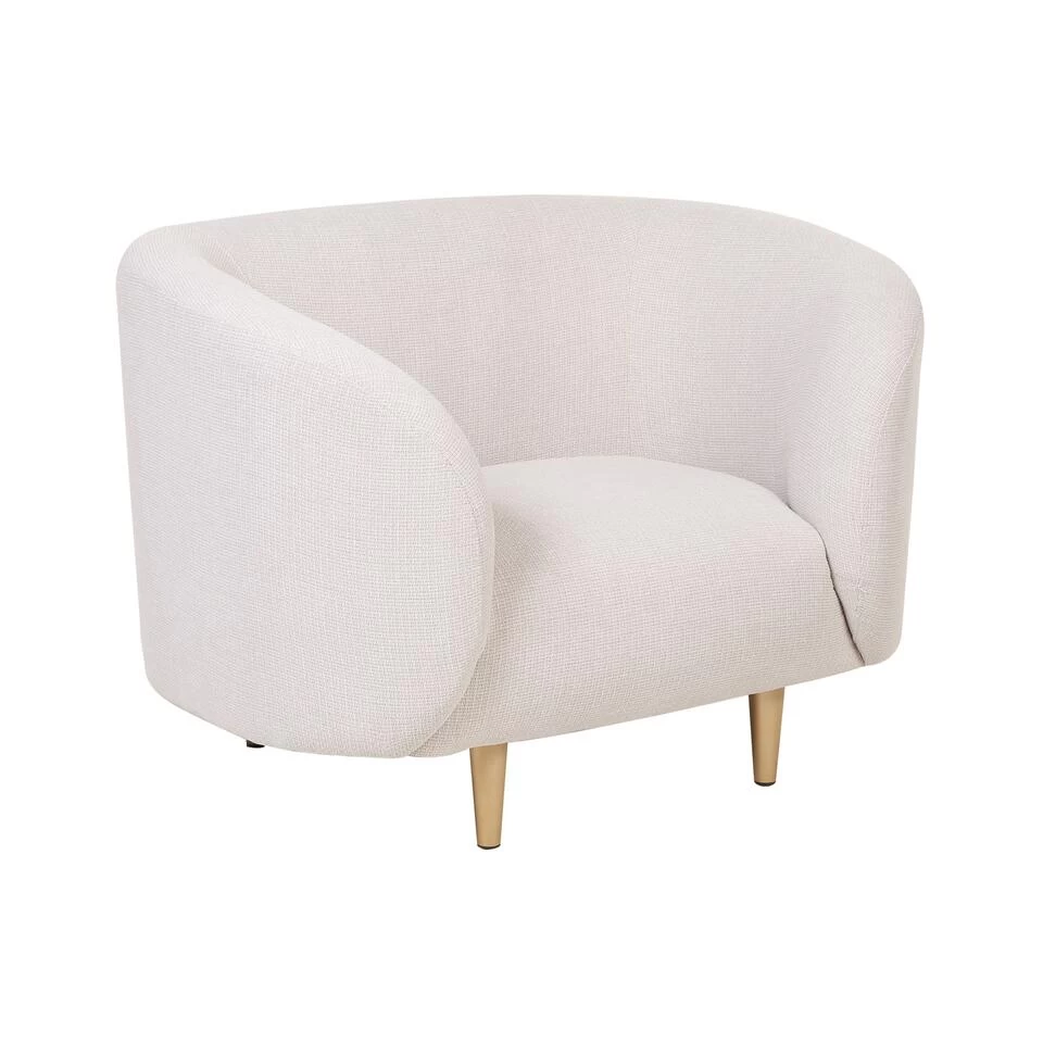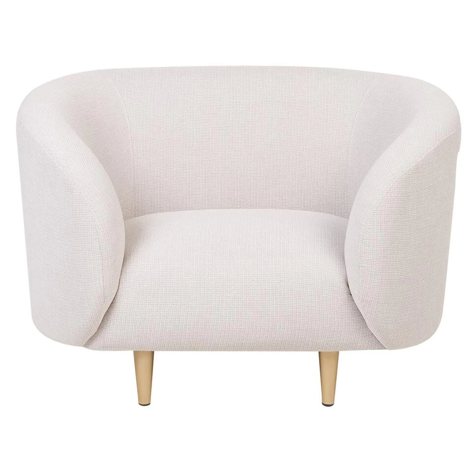 Klassieke art deco zetel. Deze prachtige fauteuil straalt een luxe gevoel uit, van de gouden poten tot de zachte rondingen van het gestoffeerde silhouet. De stof ziet en voelt aangenaam zacht en pluizig aan, wat een uitnodigende uitstraling aan de ruimte geeft. De dik beklede zitting biedt een comfortabele zitplaats, waardoor het de perfecte plek is om te lezen of ’s avonds laat te genieten van tv. Het zachte ontwerp van de zetel zal perfect passen bij interieurs in eclectische, traditionele of mid century stijl.