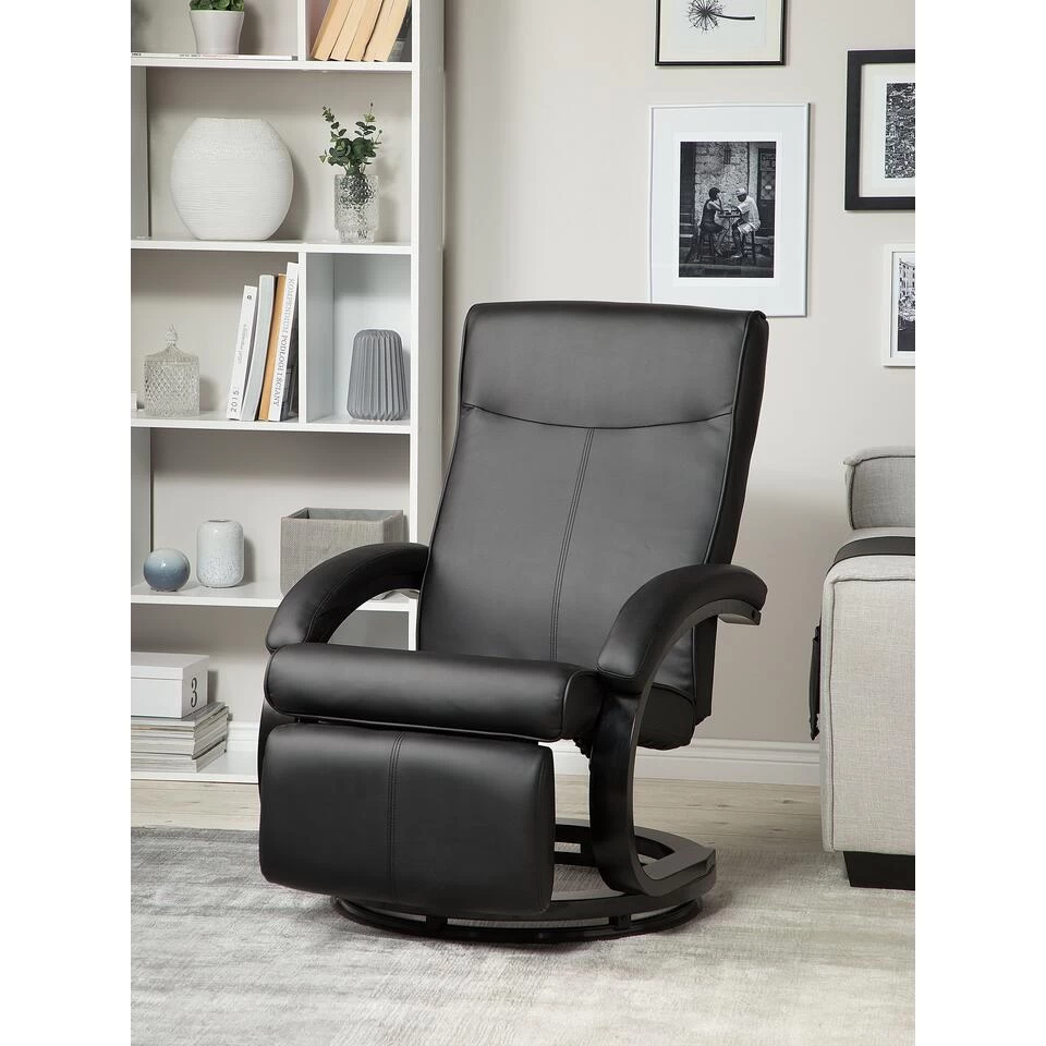 Moderne zwarte fauteuil. De functionaliteit van elke woonruimte wordt direct geüpgraded met deze stijlvolle fauteuil. Dankzij de ergonomische vorm, een verstelbare rugleuning en voetsteun, biedt de stoel absoluut comfort en zorgt hij voor een ontspannende ervaring. De stoel is bekleed met hoogwaardig kunstleer, vereist minimaal onderhoud en ziet er geweldig uit in elk interieur.