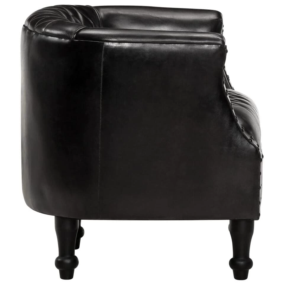 De kuipstoel is bekleed met zacht, echt geitenleer. Hij is dik gevoerd voor comfort. De houten structuur en massief mangohouten poten zijn zeer stevig en duurzaam. Met zijn sierlijk gebogen poten en getufte details voegt de fauteuil een vleugje luxe, klasse en stijl toe aan elk interieur. De kuipstoel is eenvoudig te monteren.